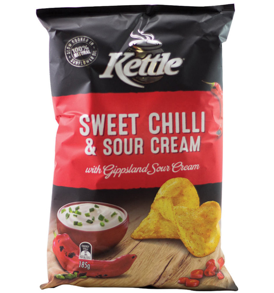 Kettle Sweet Chilli and Sour Cream potato chips are slow cooked the unique Kettle way, these potato chips are seasoned with a delicious sweet chilli, blended with sour cream from Victorias lush and fertile Gippsland region. The twist to the authentic spicy sweetness by combining it with the coolness of sour cream.