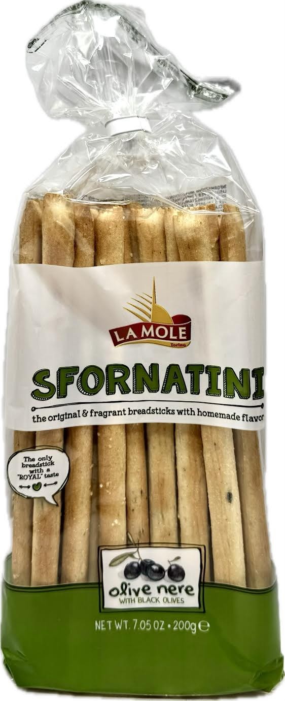 La Mole Black Olives Breadsticks Sfornatini are naturally leavened, crispy Italian breadsticks infused with the flavor of black olives and olive oil. They are known for their light and airy texture, making them a delicious and satisfying snack or accompaniment to meals.