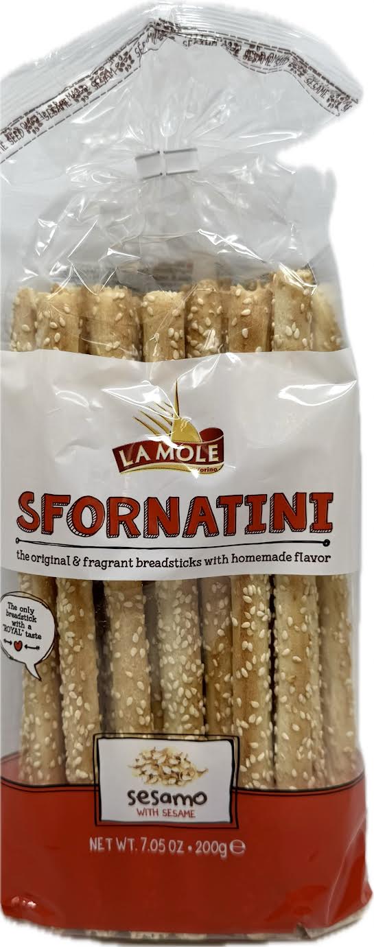 La Mole Sesame Breadsticks Sfornatini are light, crunchy breadsticks with sesame seeds, perfect for pairing with meals or enjoying as a snack. They are traditionally baked for a satisfying crispness and a delicate nutty flavor from the sesame seeds. These breadsticks are a versatile addition to any meal or a delicious standalone treat.
