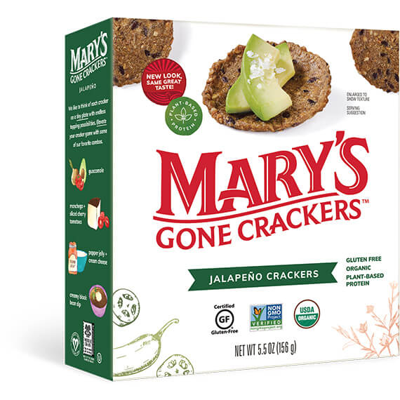 If you like your food to bite back, these were baked just for you. We’ve taken our traditional recipe of organic, gluten free, whole grain brown rice, quinoa, flax seeds, and sesame seeds and added just the right amount of mouthwatering (not eye-watering) heat for an invigorating, crunchy snack. Or you might want to top Mary’s Gone Crackers® Jalapeño Crackers with something creamy and mild for the best of both worlds!