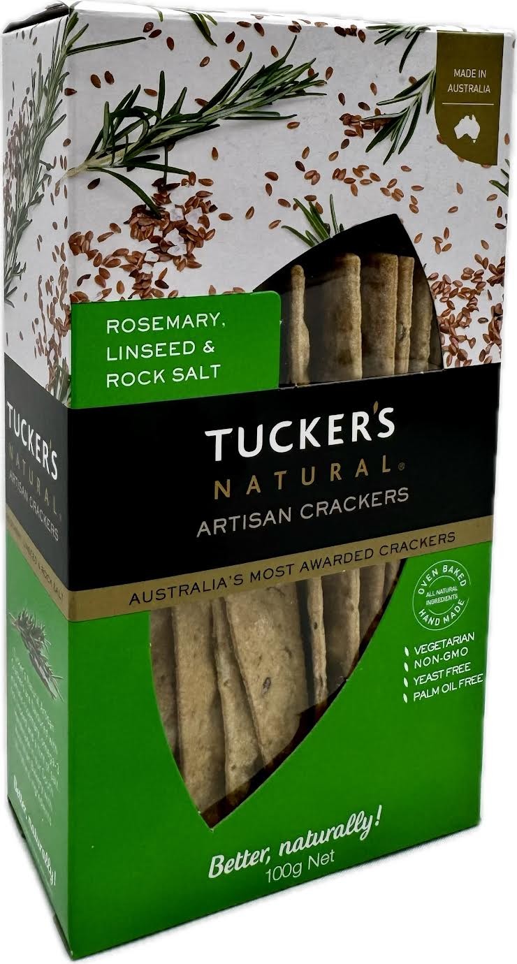 Tucker’s Natural Artisan Crackers are flavoured with aromatic rosemary, omege-3 rich linseed and a hint of salt. Handmade in our South Australian bakery with all-natural ingredients.