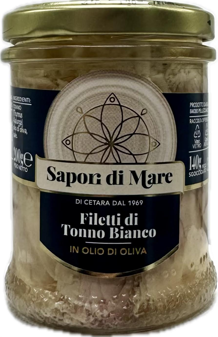 Sapori Di Mare White Tuna Fillets are premium tuna fillets, known for their high quality and flavor, preserved in olive oil. They are carefully processed by hand and steamed cooked without preservatives, ensuring a top-notch product. The tuna is typically the Albacore variety, featuring a lighter flesh, firmer texture, and milder flavor than other tuna types.