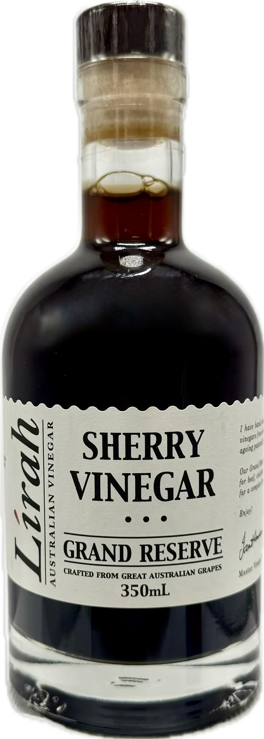 Lirah Grand Reserve Sherry Vinegar is a premium Australian-made vinegar, crafted from a sweet sherry (also known as apera) and aged for seven years in oak barrels. This vinegar is known for its rich, complex flavor and is a versatile ingredient for marinades, vinaigrettes, and gravies. It's made from 100% Australian ingredients, is all-natural, and free from artificial colors, flavors, and preservatives, and is also vegetarian-friendly and gluten-free.