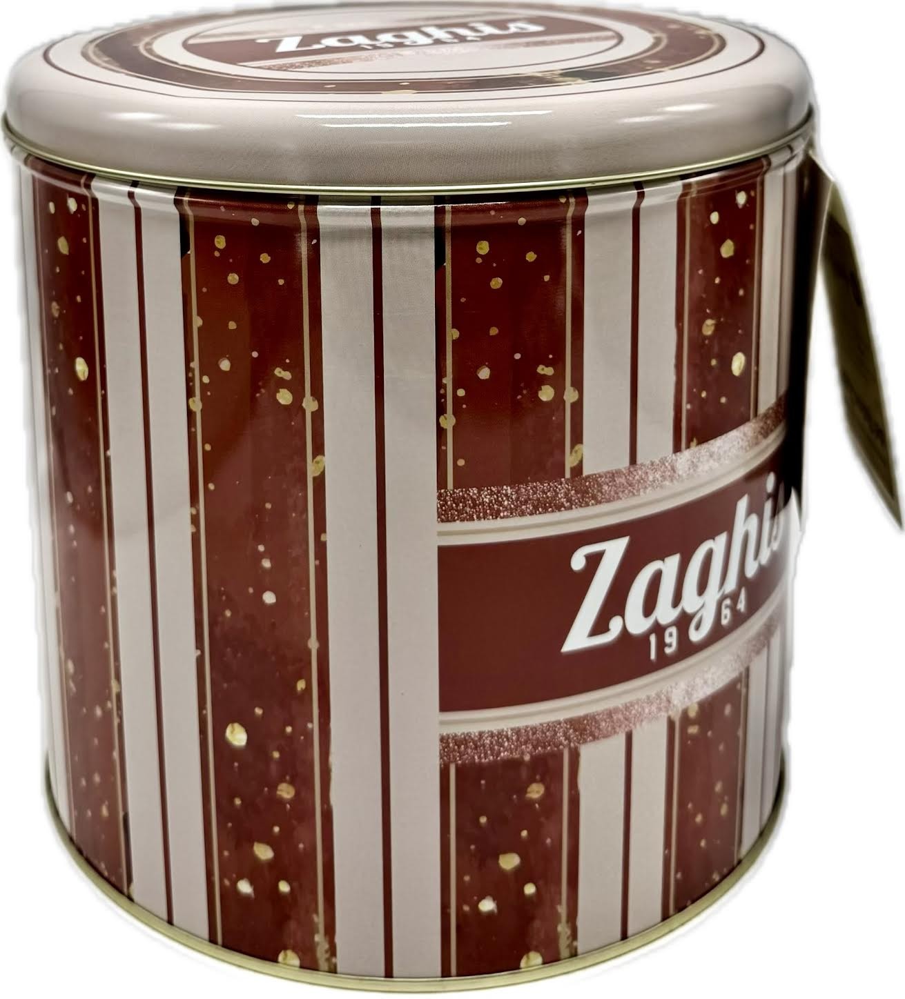 he Zaghis Panettone Classico Alto Tin is a traditional Italian Christmas cake featuring a soft, fragrant dough enriched with candied orange peel, Diamante citron, and sultanas. It is made using fresh, high-quality ingredients like Italian free-range eggs and milk, with natural leavening. The panettone comes in a decorative, reusable tin box, making it a suitable gift option.