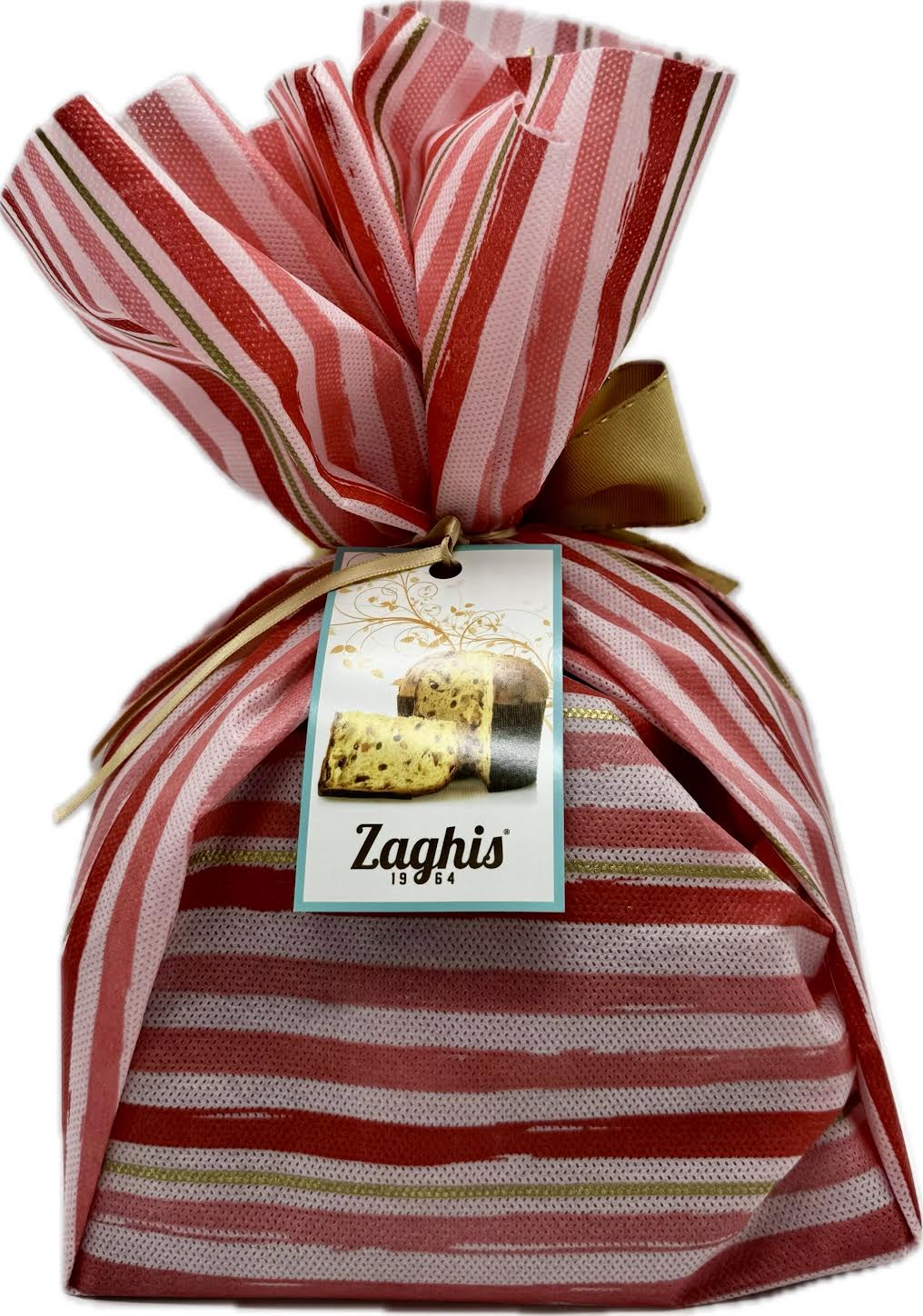 Zaghis Panettone 750g is a traditional Italian, naturally leavened oven-baked sweet bread that is soft and fragrant, with different varieties available such as classic with candied fruit and raisins, or others with chocolate chips, figs, or walnuts. It is a popular festive gift, known for its high-quality ingredients