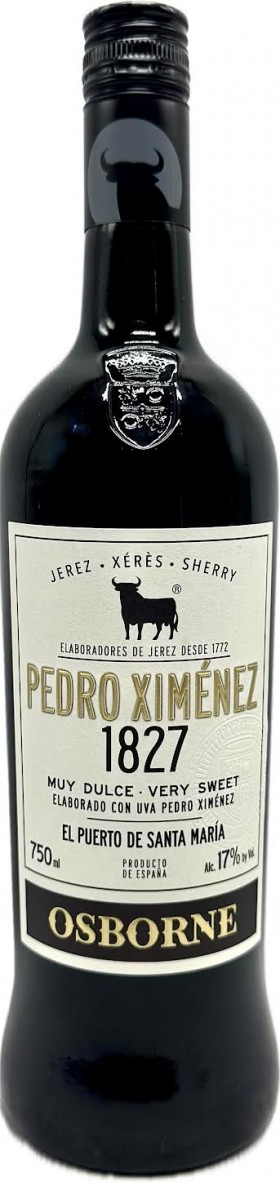 Osborne Pedro Ximenez 1827 Sherry is a deeply sweet, dark mahogany-colored fortified wine known for its intense aromas of raisins, dates, honey, and almonds, complemented by flavors of bitter chocolate, caramel, and spices. It has a thick, unctuous, and complex character, a long and lingering finish, and is traditionally aged in American oak barrels using the Soleras and Criaderas system. This rich wine is best enjoyed as a dessert wine on its own, or paired with desserts, blue cheese, or dark chocolate.