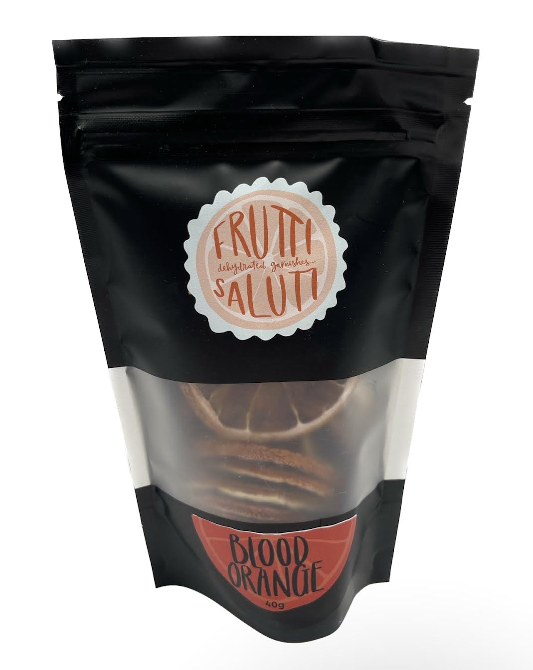 Frutti Saluti Dried Blood Orange Cocktail Garnishes. Australian dried blood orange wheels add a burst of taste to any beverage. No preservatives, flavours, or colours added. Perfect for a Gimlet, Negroni or G&T. Vegan-friendly and gluten-free.