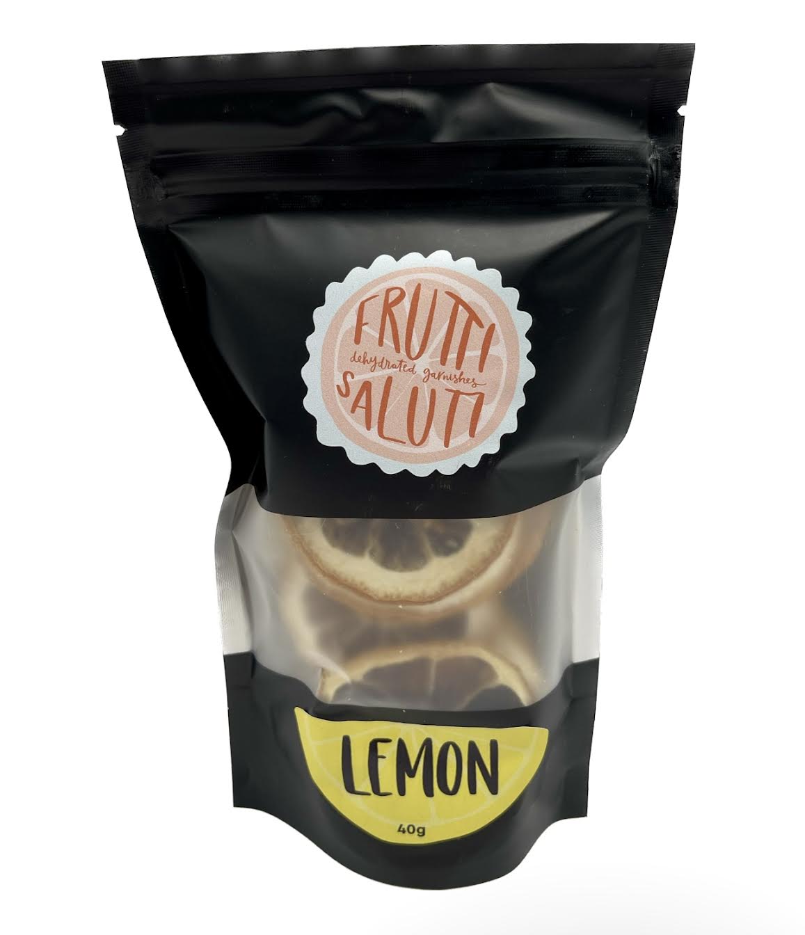 Frutti Saluti Dried Lemon Cocktail Garnishes. Australian dried lemon wheels add a burst of taste to any beverage. No preservatives, flavours, or colours added. Perfect for a G&T, Lemon Drop, or tangy Tom Collins. Vegan-friendly and gluten-free.