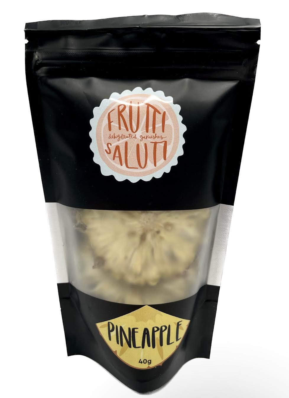 Frutti Saluti Dried Pineapple Cocktail Garnishes. Australian dried pineapple slices add a burst of taste to any beverage. No preservatives, flavours, or colours added. Perfect for a spicy Margarita or Pina Colada. Vegan-friendly and gluten-free.
