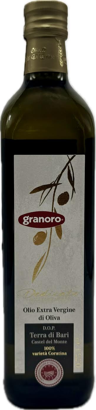 Granoro Dedicato EVO DOP Terra di Bari is a high-quality extra virgin olive oil produced in the Terra di Bari region of Apulia, Italy. Specifically, it's a mono-cultivar oil, meaning it's made exclusively from Coratina olives, a variety known for its intense flavor. The oil is characterized by a lively fruity aroma with green olive notes and hints of almond, coupled with a balanced bitter and spicy taste.