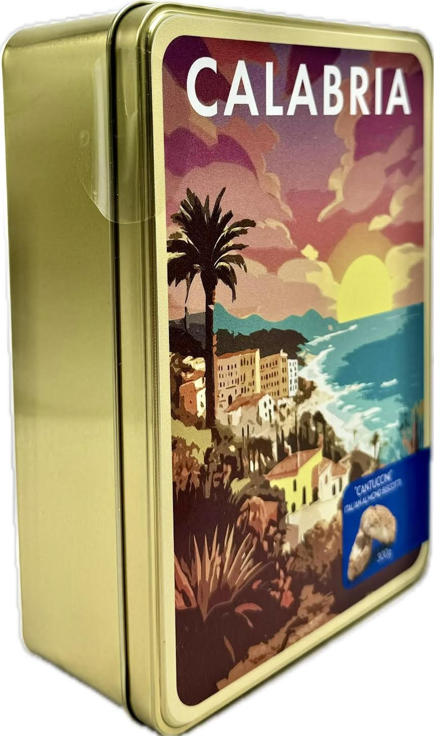 Italia Calabria Almond Biscotti 300g is a tin of twice-baked, crunchy biscuits from the Calabria region of Southern Italy, made with premium almonds for a nutty, slightly sweet flavor. These biscotti are perfect for dipping in coffee or tea and are presented in a decorative tin that makes them an elegant gift or a souvenir of Italian craftsmanship.