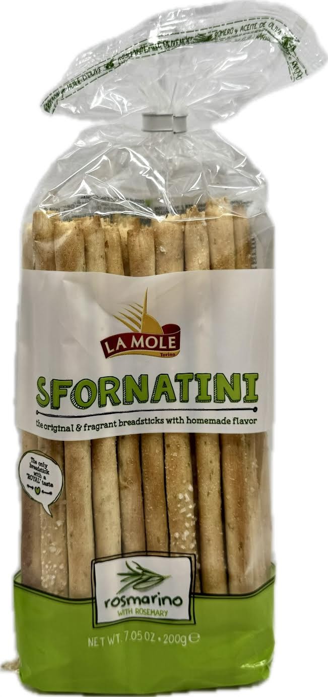 La Mole Rosemary Breadsticks Sfornatini are naturally leavened, crunchy breadsticks infused with the aromatic flavor of rosemary. They are described as light, tempting, and perfect for pairing with meals or enjoying as a snack. The breadsticks are produced in Italy and may contain traces of sesame seeds and soybean. They are a popular choice for complementing cheeses, soups, and salads, or simply enjoyed on their own.