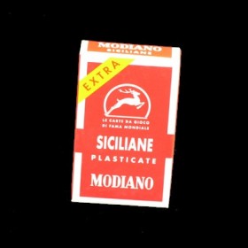 This deck is the Siciliane. It is from the Spanish regional style of Italian playing cards. Although played throughout Italy, it is most commonly played in the Sicily region. This is a plastic-coated playing card made of triplex cardboard. Triplex cardboard is thicker and meant to last longer than a normal plastic-coated playing card.