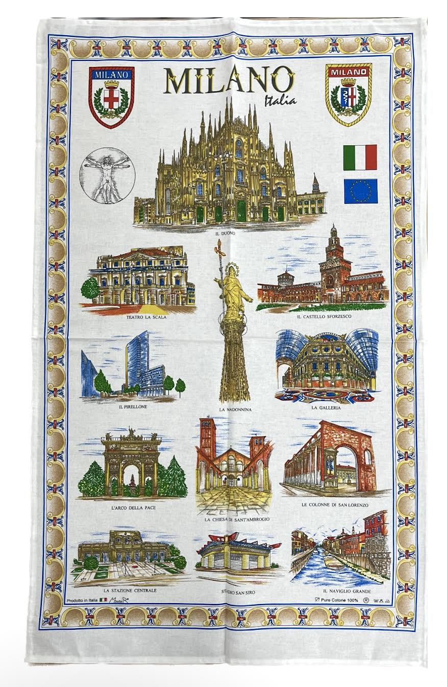 A tea towel is just like a normal towel or napkin, but instead of being thick it is soft and thin. It 100% cotton, 100% made in Italy and has beautiful Milan Attractions
