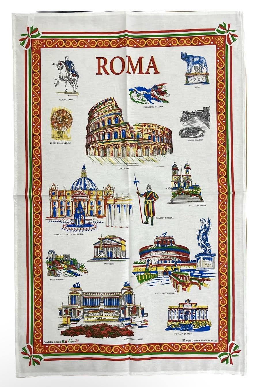 A tea towel is just like a normal towel or napkin, but instead of being thick it is soft and thin. It 100% cotton, 100% made in Italy with beautiful Rome Landmarks and attractions