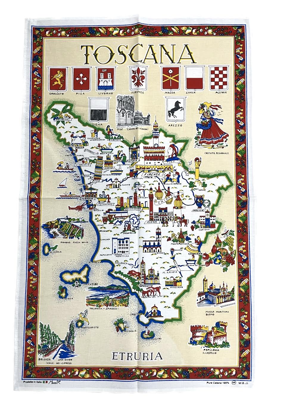 A tea towel is just like a normal towel or napkin, but instead of being thick it is soft and thin. It 100% cotton, 100% made in Italy and has a beautiful Toscana Map