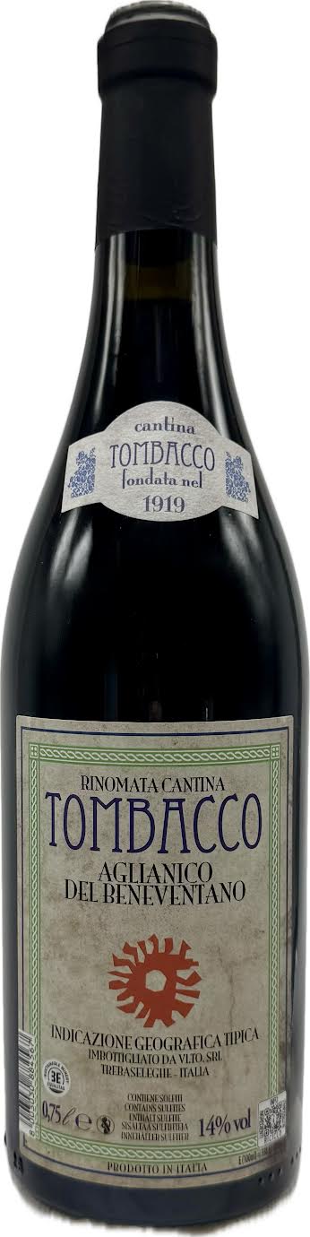 Rinomata Tombacco Aglianico del Beneventano is a full-bodied, red wine from Southern Italy, specifically the Beneventano region of Campania. It is made entirely from the Aglianico grape, known for its deep color and strong, tannic structure. The wine features a complex aroma of dark fruits like cherry and red currant, along with notes of licorice, herbs, and spice.