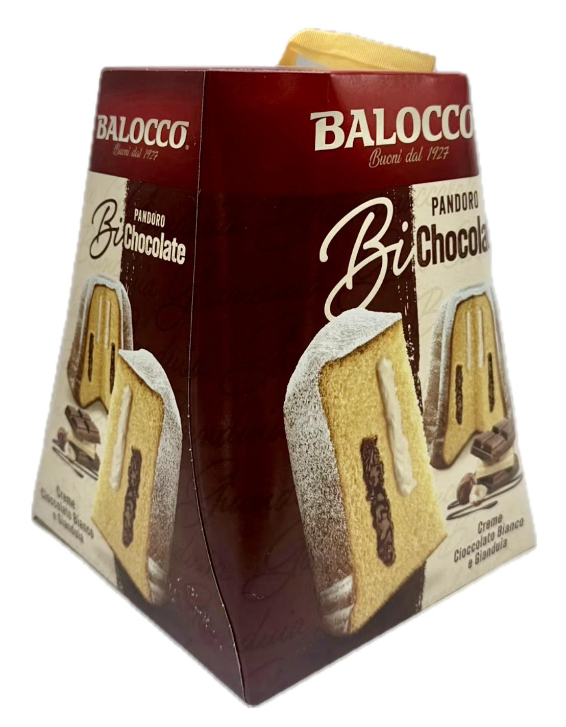 Balocco Pandoro Bi-Chocolate is a traditional Italian holiday cake made with premium ingredients. This fluffy, star-shaped cake is filled with rich white chocolate and gianduia creams, and comes with a sachet of fine sugar for dusting. Perfect for festive celebrations, it offers a delightful blend of buttery sweetness and chocolatey goodness.