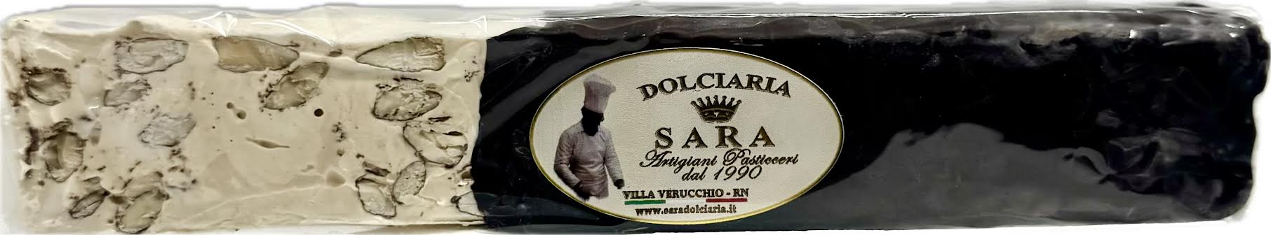 Dolciaria Sara hard nougat covered in chocolate features a classic Italian confectionery experience. It combines a crisp, hard nougat base made with honey, sugar, and nuts (often almonds and hazelnuts) with a rich chocolate coating. The nougat offers a satisfying crunch and a sweet, nutty flavor, complemented by the smooth, decadent chocolate.
