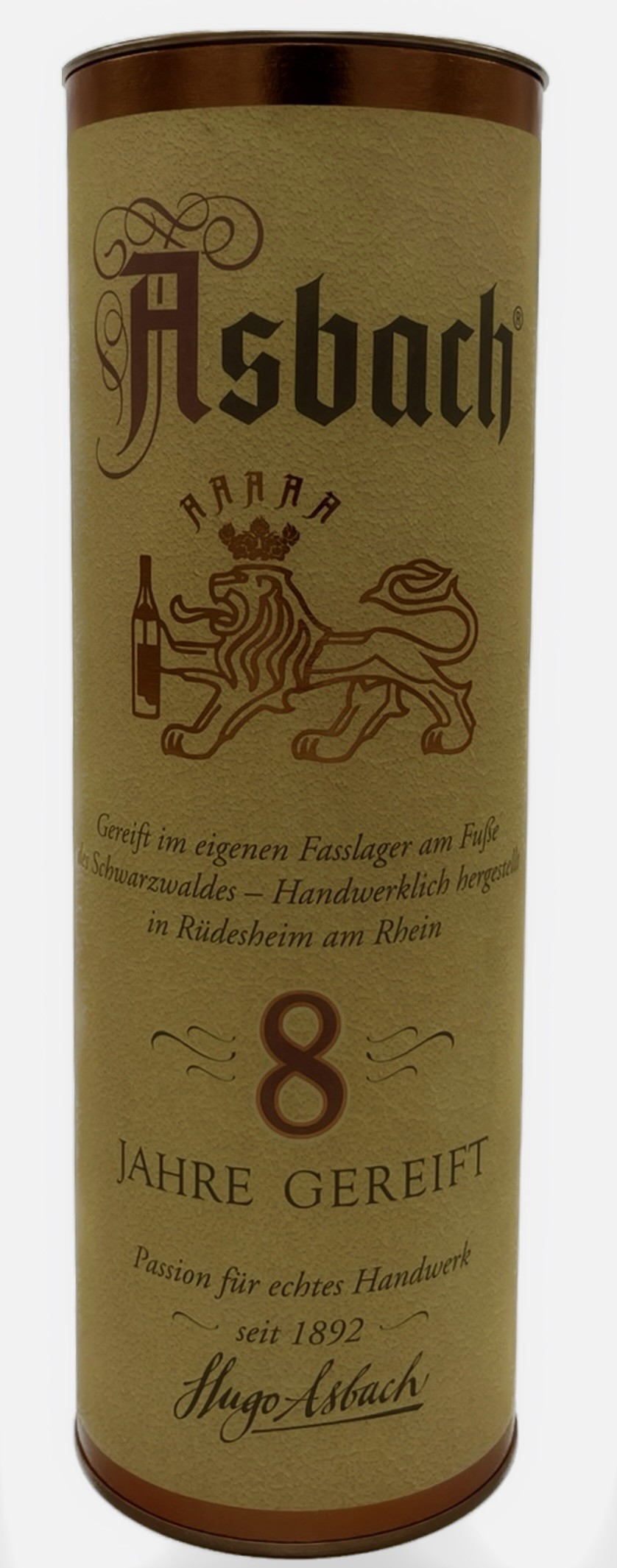 Asbach 8 Year Old is a popular rich, spicy German brandy which has been matured in small French Limousin oak casks. The color is dark amber. The aroma is fruity, with shades of chocolate and cedar wood. The taste is rich, spicy, fruity, almond, with hints of spices.