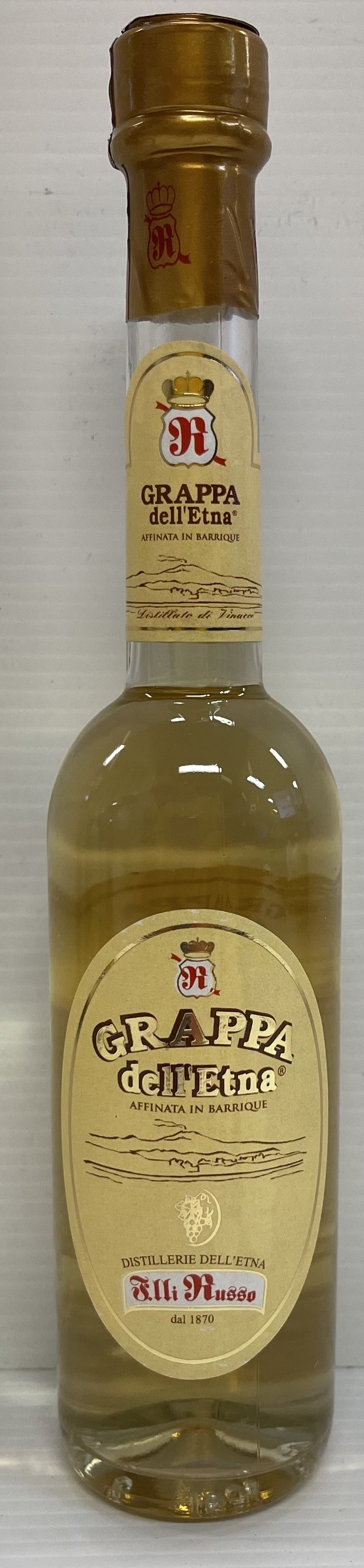 Obtained from the distillation of fermented marc of fine grapes, the Etna Grappa assumes, after aging in oak barrels, an amber color with bright reflections, maintaining its natural clarity.
