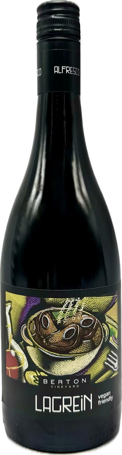 The Berton Alfresco Lagrein description highlights a rich, full-bodied red wine with aromas of blood plum, blackberry, aniseed, and milk chocolate. On the palate, it features flavors of morello cherry and dark chocolate, with silky tannins and gentle acidity. It is described as a deeply colored and structured wine that pairs well with rich foods.