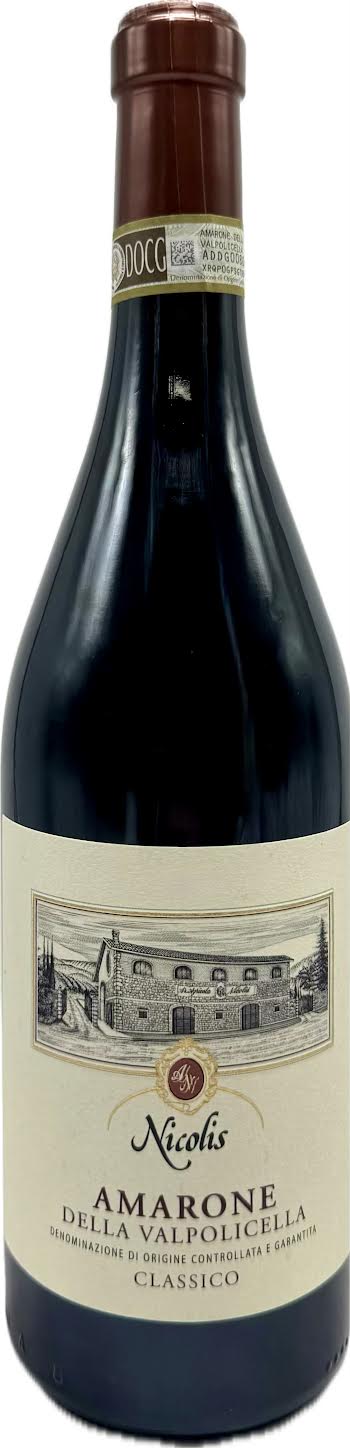 Nicolis Amarone Valpolicella Classico DOCG is a rich, full-bodied, powerful red wine from Veneto, Italy, made using the traditional appassimento method of drying grapes before fermentation to concentrate flavors. It features complex aromas of dried fruit, spice, chocolate, and earthy notes and offers a rich, velvety palate with balanced acidity, fine tannins, and a long, luxurious finish, ideal for pairing with game, aged cheeses, and roast meats.