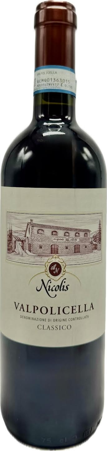 Nicolis Valpolicella Classico DOC is a dry, red wine from the Veneto region of Italy, characterized by its ruby-red color, a delicate bouquet of cherries, plums, and spices, and a harmonious, savory palate with slightly bitter and earthy notes. Made primarily from the Corvina, Rondinella, and Molinara grape varieties, this light-bodied wine is fermented in steel tanks, aged briefly, and is an ideal pairing for everyday meals, including starters, cold cuts, pizza, and even fatty fish.