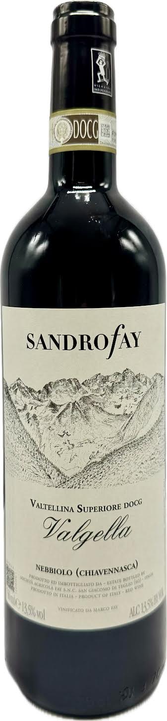 Sandro Fay Valtellina Superiore Valgella is a Nebbiolo wine (locally Chiavennasca) from the alpine Valtellina valley in Lombardy, Italy. Descriptions highlight its purity of fruit, with notes of red cherry, wild strawberry, and dark berries, intertwined with balsamic, spice, tobacco, and smoke. The wine offers a refined, full-bodied, and energetic palate with fine acidity and medium tannins, leading to a persistent, often mineral, and slightly salty finish.