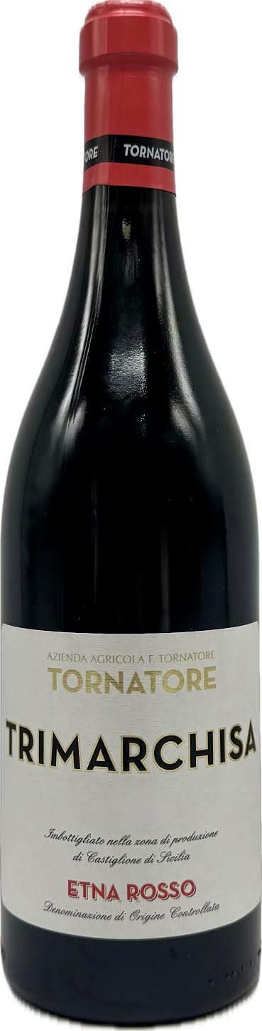 Tornatore Trimarchisa Etna Rosso is a medium-bodied red wine from Sicily made primarily from Nerello Mascalese and Nerello Cappuccio grapes grown on the volcanic slopes of Mount Etna. It has a ruby color and presents a complex bouquet of red berries, dark cherry, and smoky mineral notes, with savory hints of leather and spice. The palate is elegant and balanced, with silky tannins, vibrant acidity, and a long, mineral-driven finish with a saline edge.