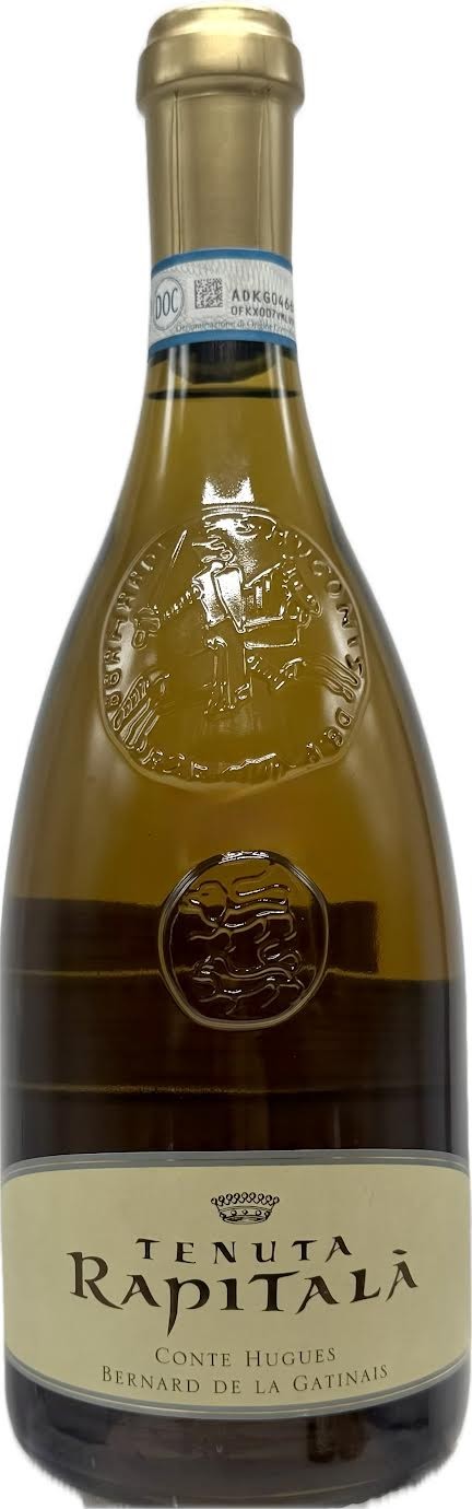 Rapitalà's Conte Hugues Chardonnay is a Sicilian white wine with a bright straw yellow color and greenish reflections. It offers a complex nose of tropical fruits like mango and papaya, orange zest, chamomile, and Mediterranean herbs. The palate is described as soft, refined, and satisfying, with a long, persistent finish. It's known for its Mediterranean character and balanced structure. The wine is produced from 100% Chardonnay grapes grown in Sicily.