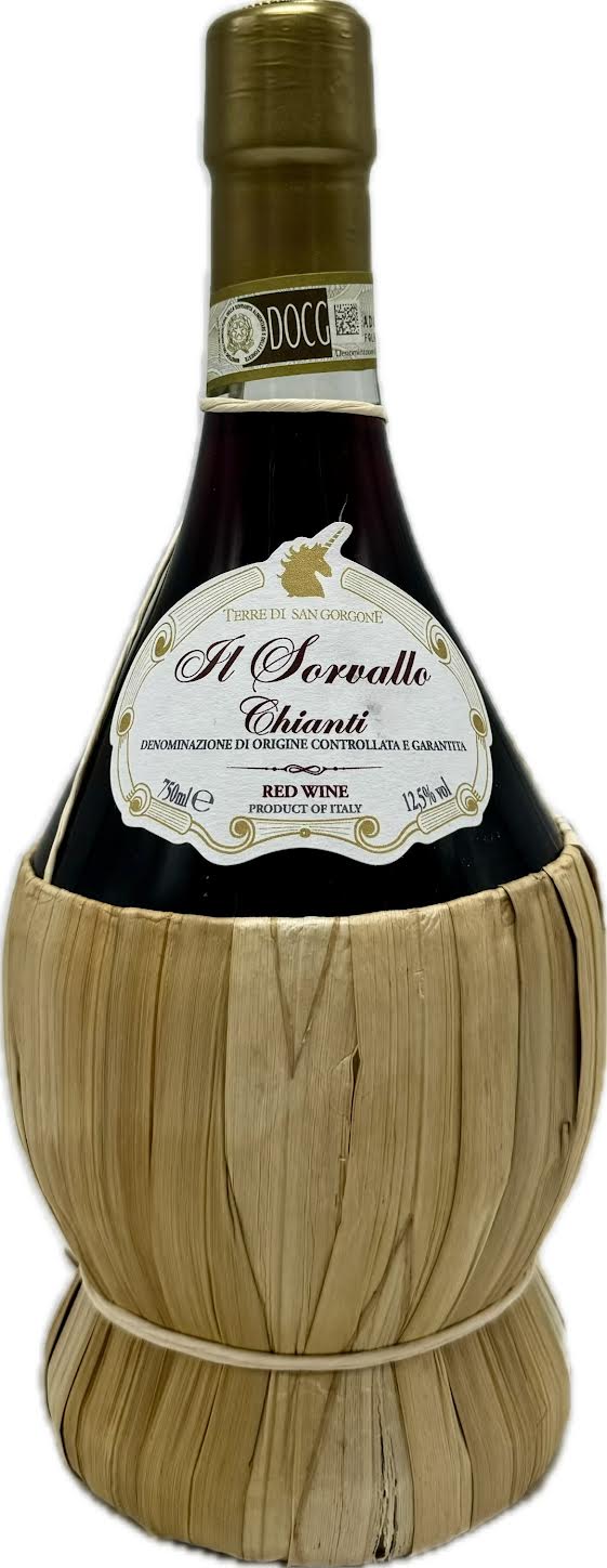 The Terre di San Gorgone Chianti flask is a traditional Chianti DOCG red wine, often presented in the classic fiasco—a squat bottle with a straw basket base.
